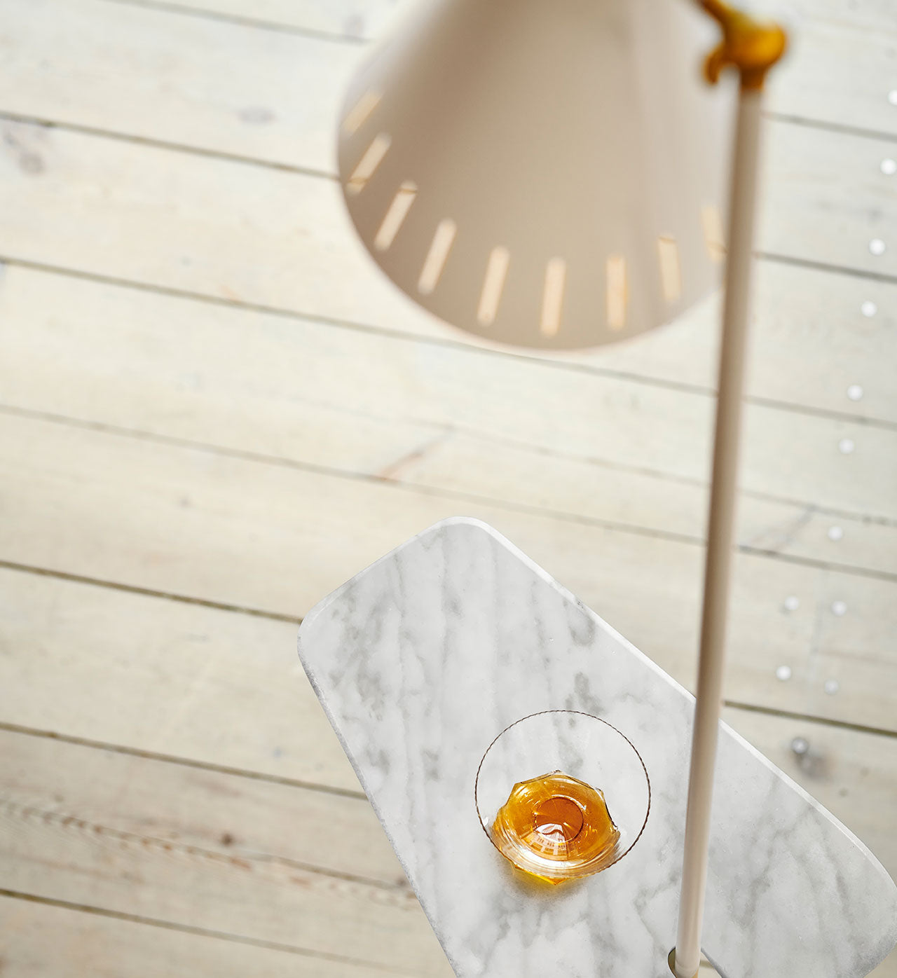 The Cone floor lamp is an extremely elegant lamp to have standing next to the sofa or an armchair. The floor lamp contributes great personality to the interior as it stands and balances on its three legs. The floor lamp comes with a shelf table in tea-oiled solid oak to pay tribute to the 50's love of dark, warm wood. The shelf table is treated with a clear lacquer, so you can have a hot cup of coffee standing without leaving marks on the surface.
