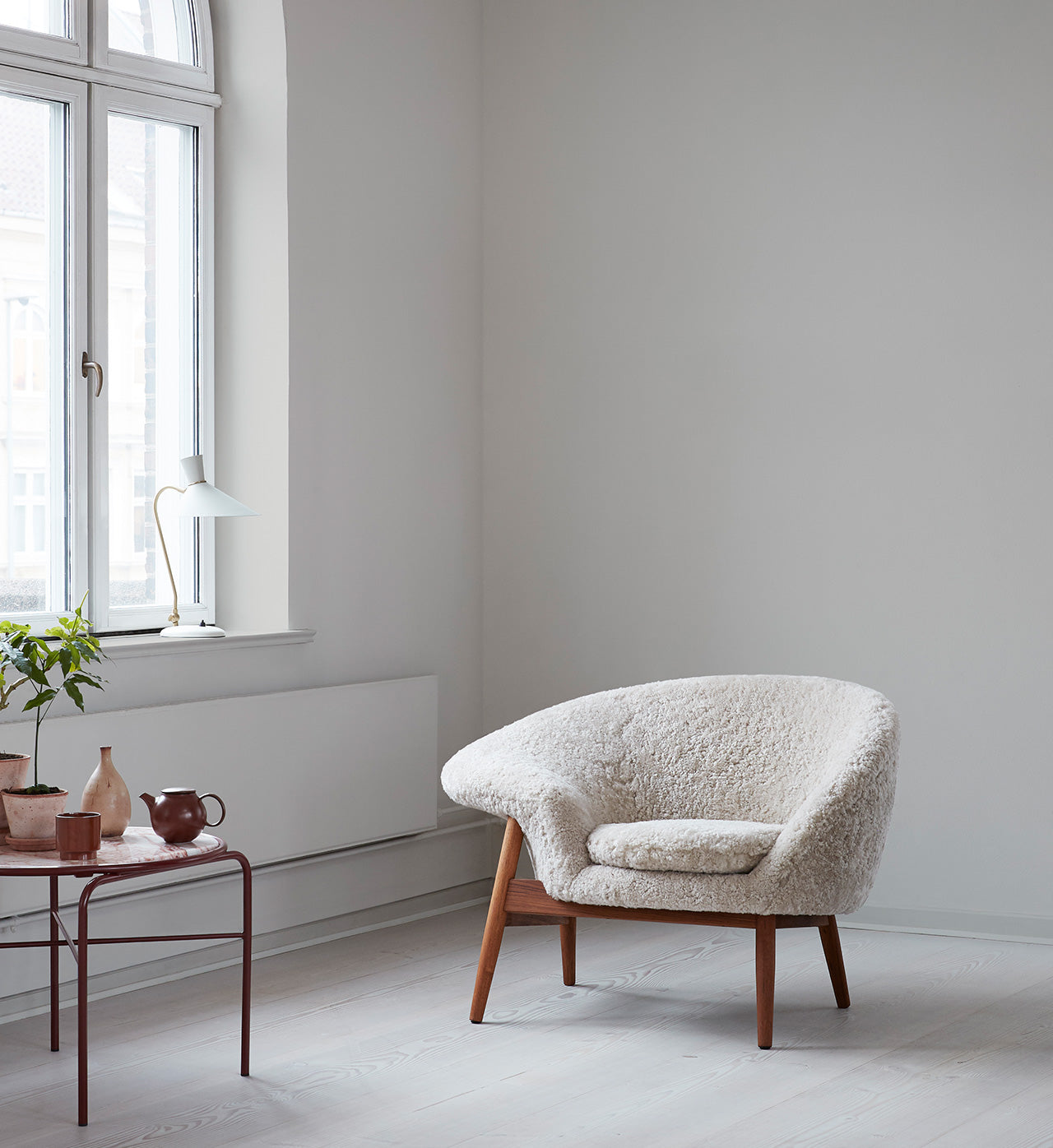 If you want an interior that exudes exclusivity and Danish design, an eye-catching armchair like Fried Egg is a good choice. The armchair stands out from today's furniture with its unique style and extraordinary design. With the modern textiles, the chair draws references to the present and can thereby be included in both a classic and more modern, minimalist decor. Here, Fried Egg is combined with a contemporary side table in dark wood and an organic shape that harmonizes with the chair's playful style and, together with the aubergine-coloured textile, creates a subdued and exclusive style in the living room.