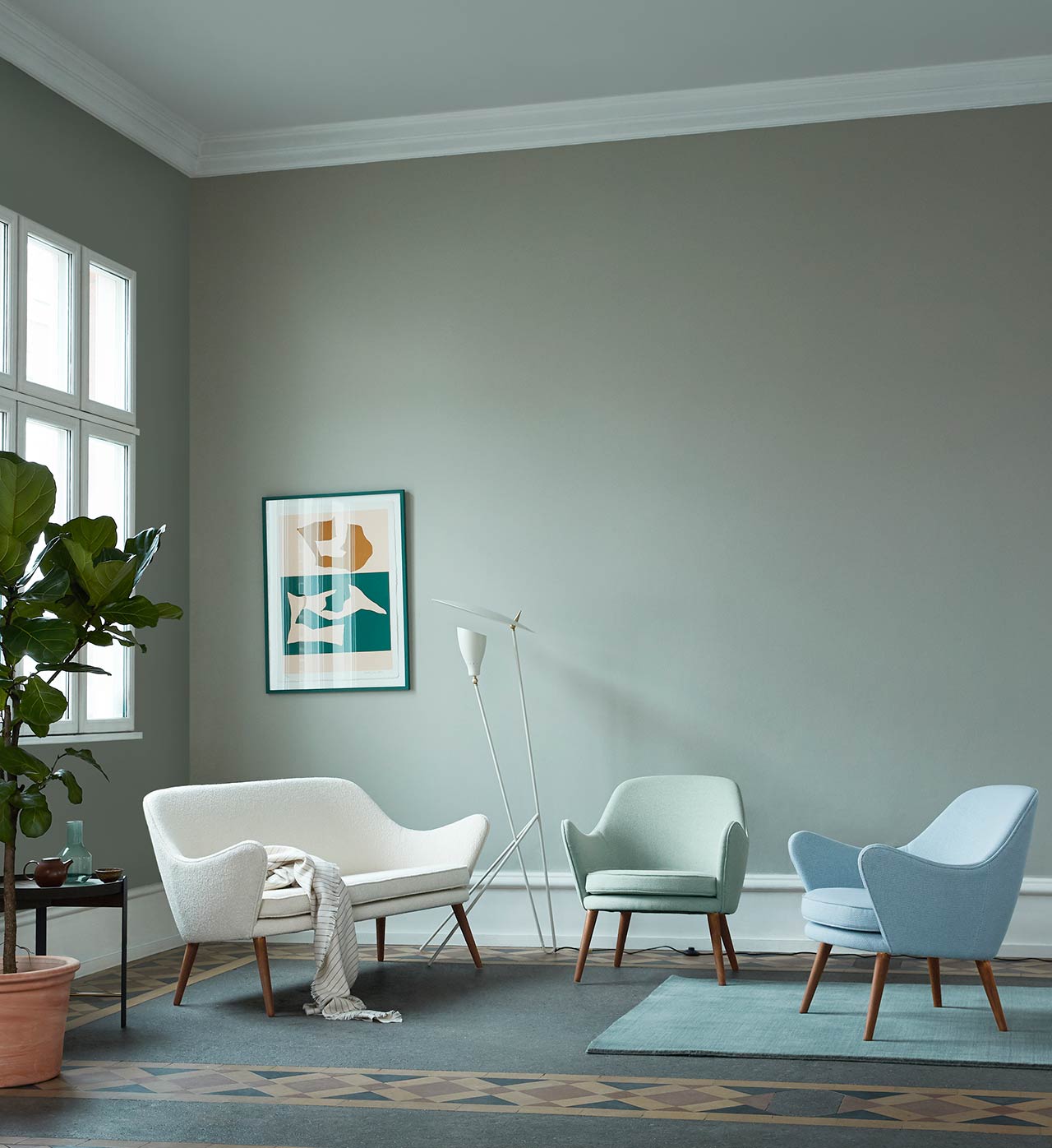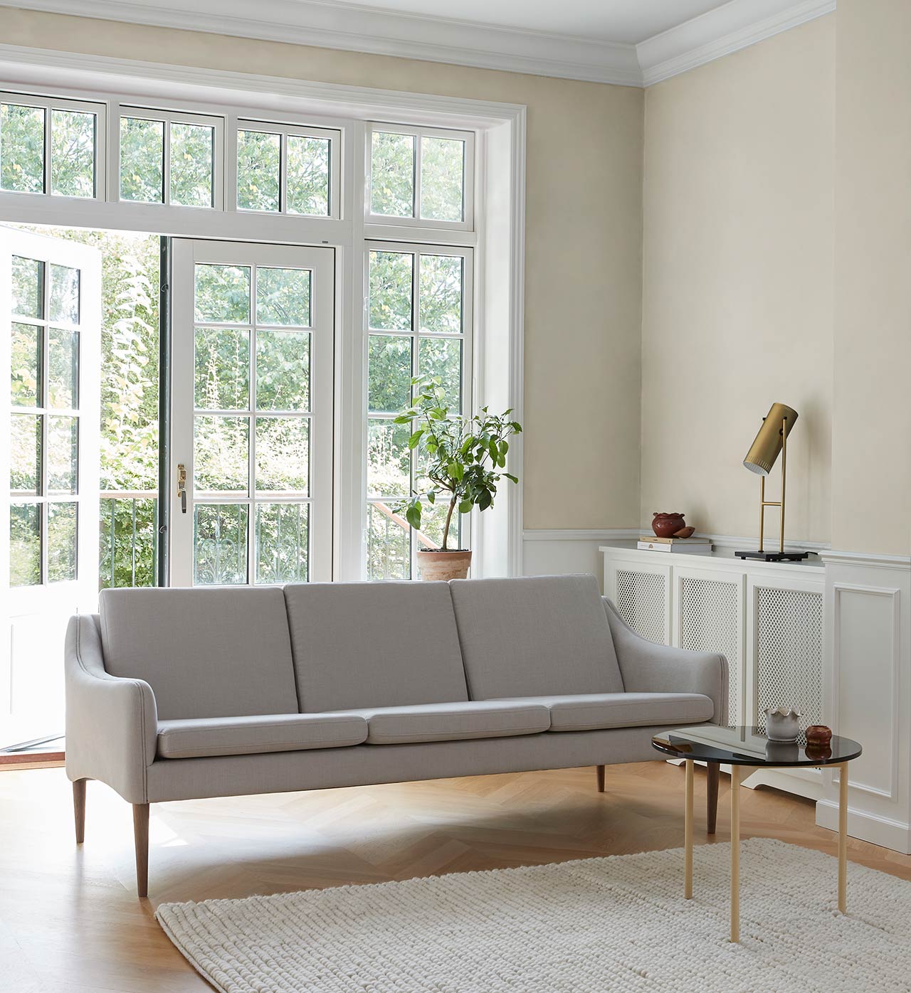 The bright home gains personality and charisma in the meeting with classic furniture such as our Mr. Olsen sofa from 1958 and Trombone lamp in brass, which add edge to an otherwise simple interior.