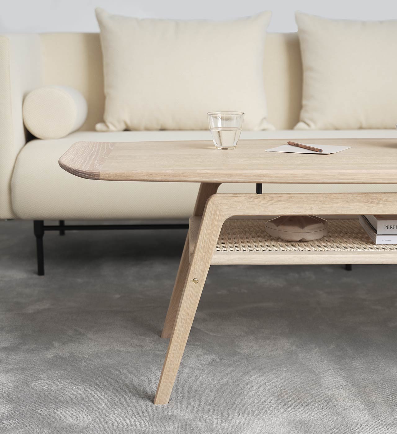 The spacious Surfboard coffee table was designed by Arne Hovmand-Olsen in 1959. The table top's design is inspired by the shape of a surfboard and gives the coffee table an inherent lightness that makes it slide effortlessly into a modern interior. The coffee table is available with an elegant shelf in solid wood and French wicker, adding an extra dimension to the iconic design.