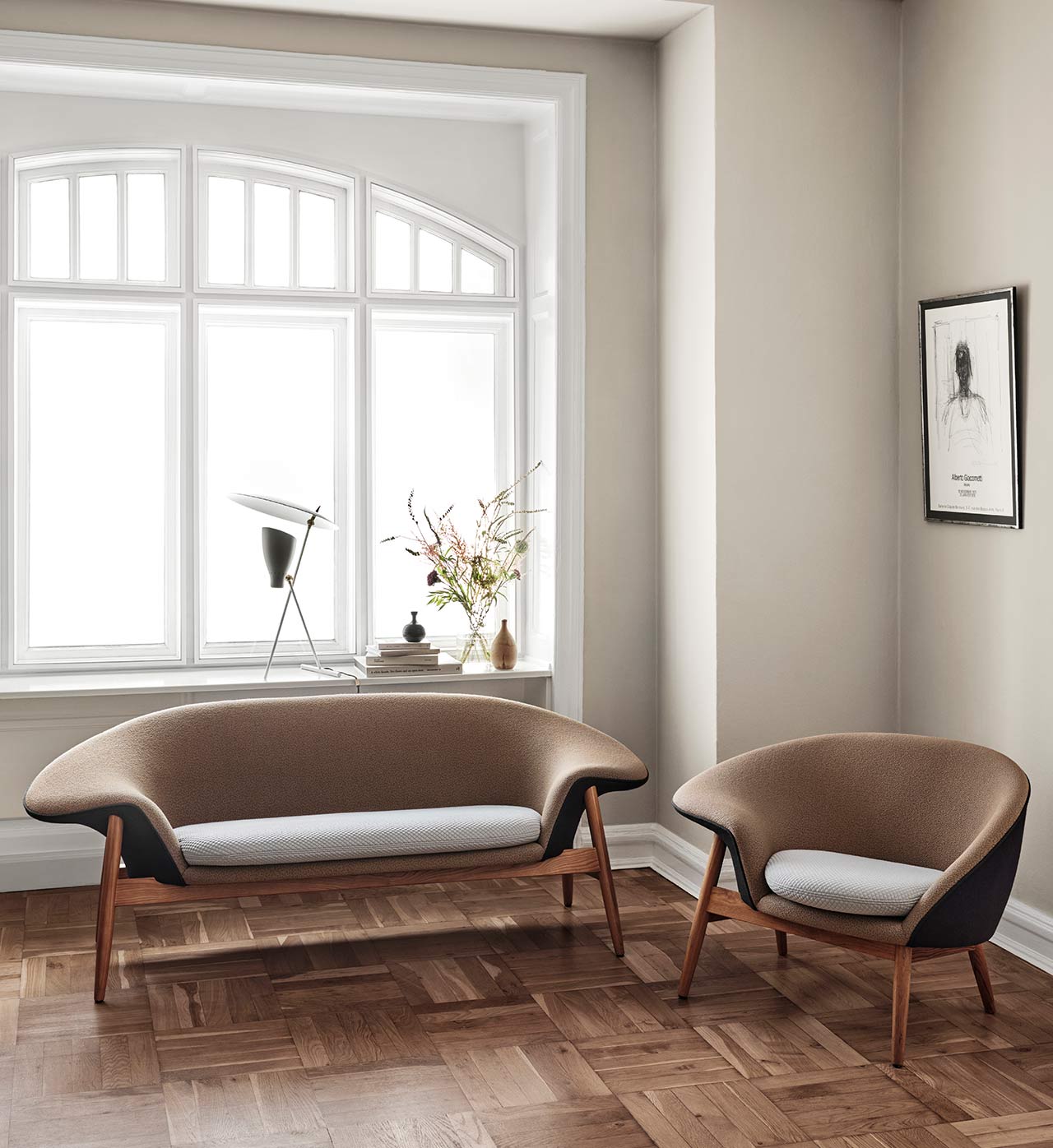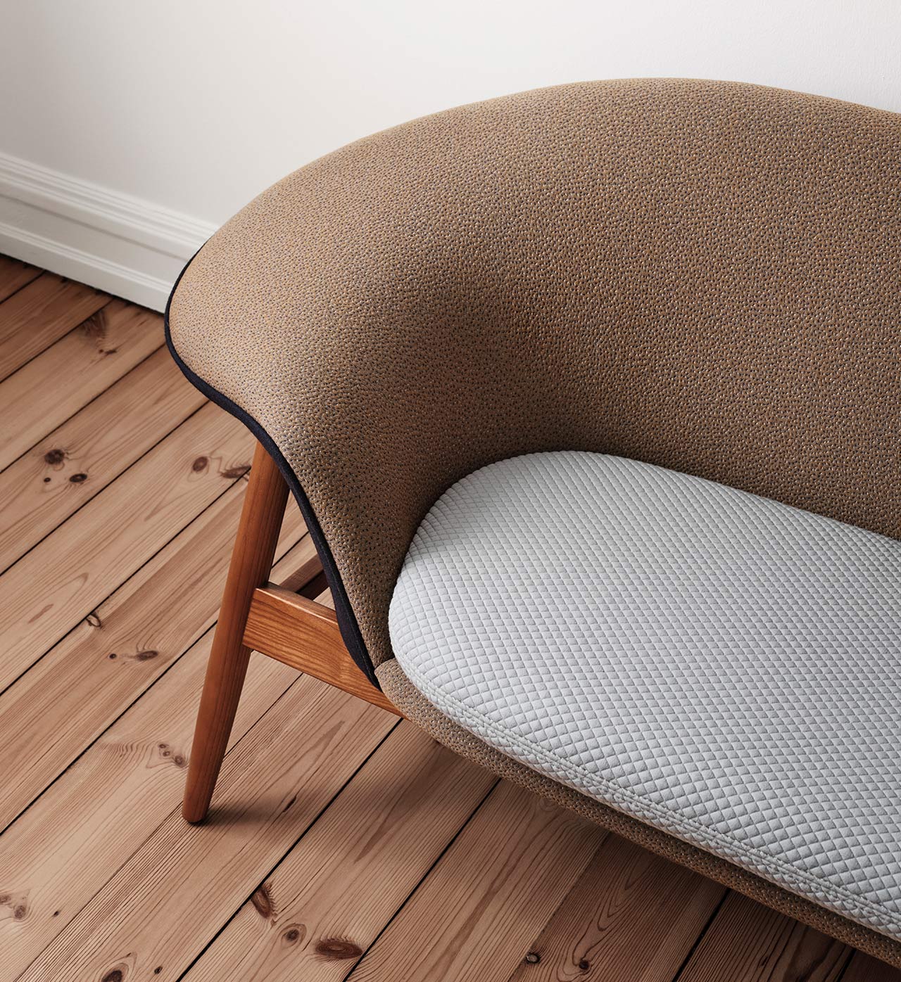 As a tribute to the 50s' joy of color and love for teak, the Fried Egg sofa is produced in this elegant type of wood and with exclusive textiles in carefully selected colors from the Warm Nordic universe. Choose between stylish, single-coloured variants or two-coloured versions that give the design a playful expression. In the selection you will also find a version in soft, luxurious lambskin as well as sustainable textiles made from recycled plastic and recycled wool. Of course in the same high quality that characterizes all our designs.