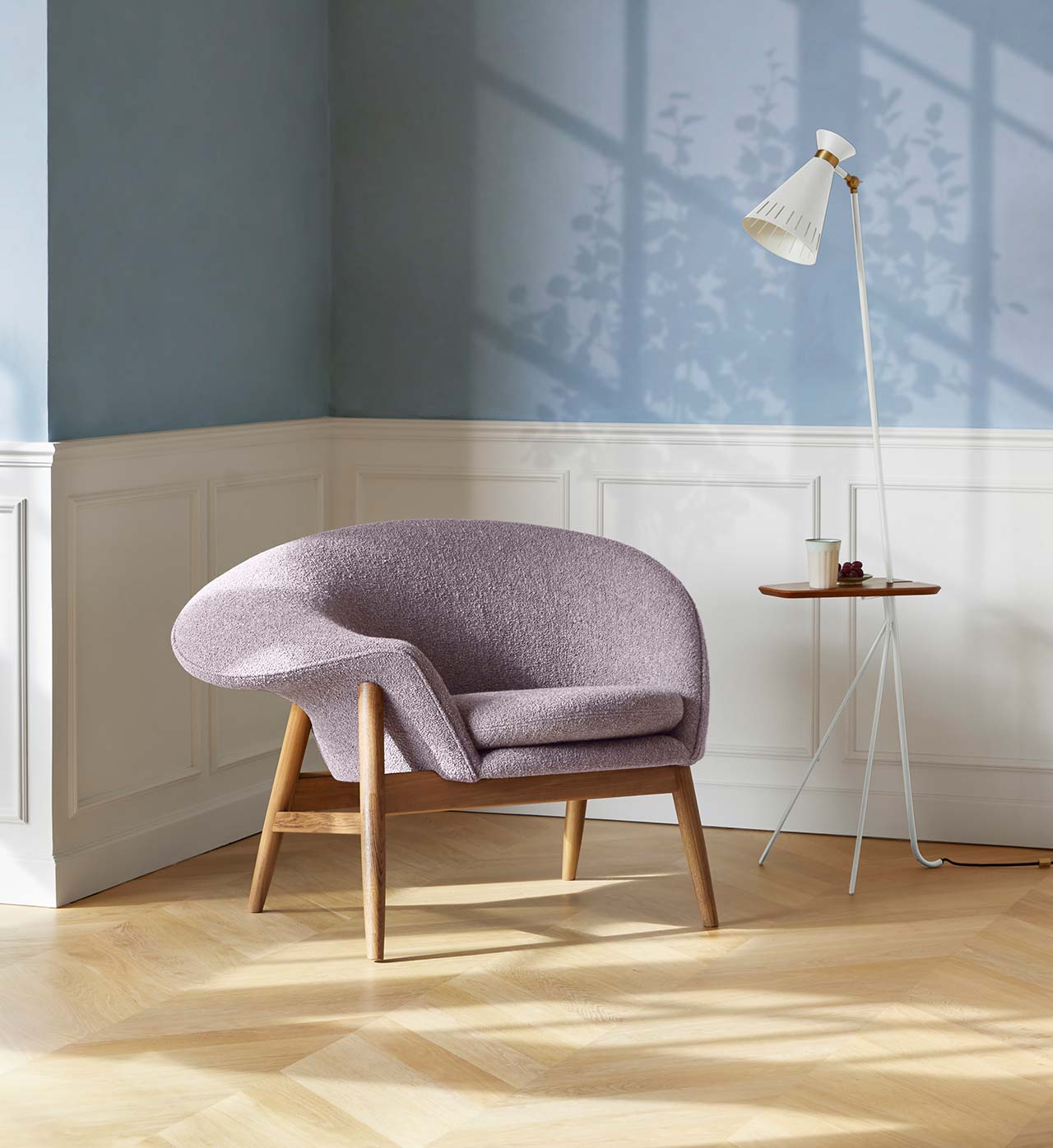 Silhuetten er asymmetrisk og med karakterfulde linjer og bløde kurver formår stolen at tilføre kant til ethvert hjem. Formen skaber rummelighed og det flade armlæn åbner op for verdenen, mens det inviterer til at hvile mageligt og nonchalant.