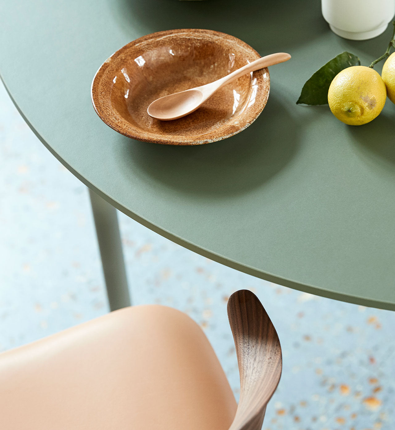Affinity spisebordet med bordplade i linoleum har et varmt og indbydende design, der bidrager med en uhøjtidelig atmosfære til dagens måltider, mens det organiske linoleum skaber den perfekte harmoni mellem æstetik og funktion.